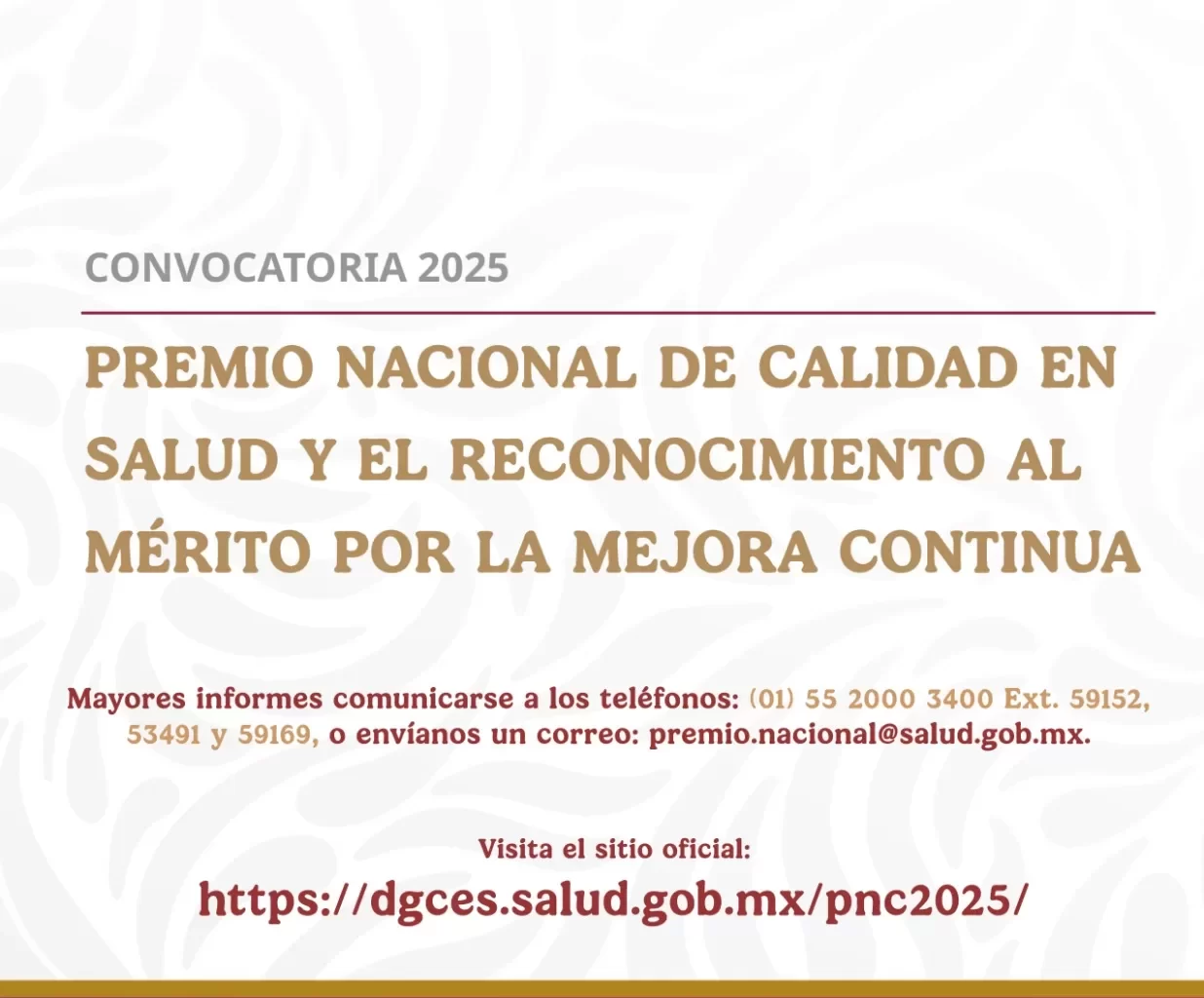 Oaxaca de Juárez, Oax. 19 de mayo de 2025.- Con el compromiso de fortalecer la excelencia en la atención médica y reconocer a quienes impulsan la mejora continua, la Dirección de Innovación y Calidad de Servicios de Salud de Oaxaca (SSO) convoca a las unidades del sector a participar en el Premio Nacional de Calidad en Salud (PNCS) y el Reconocimiento al Mérito por la Mejora Continua (RMMC) 2025.