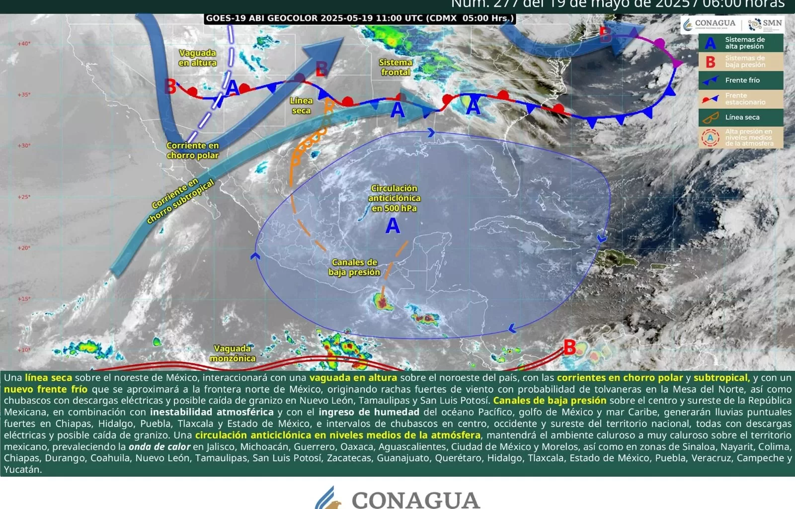 Oaxaca de Juárez, Oax. 19 de mayo de 2025.- La Coordinación Estatal de Protección Civil y Gestión de Riesgos (CEPCyGR) informa que, este lunes, la ola de calor estará fragmentada y limitada en algunos municipios del oeste de la entidad, además de cielo despejado durante la mañana y medio nublado por la tarde; bajo la influencia del sistema anticiclónico que mantiene estabilidad atmosférica.