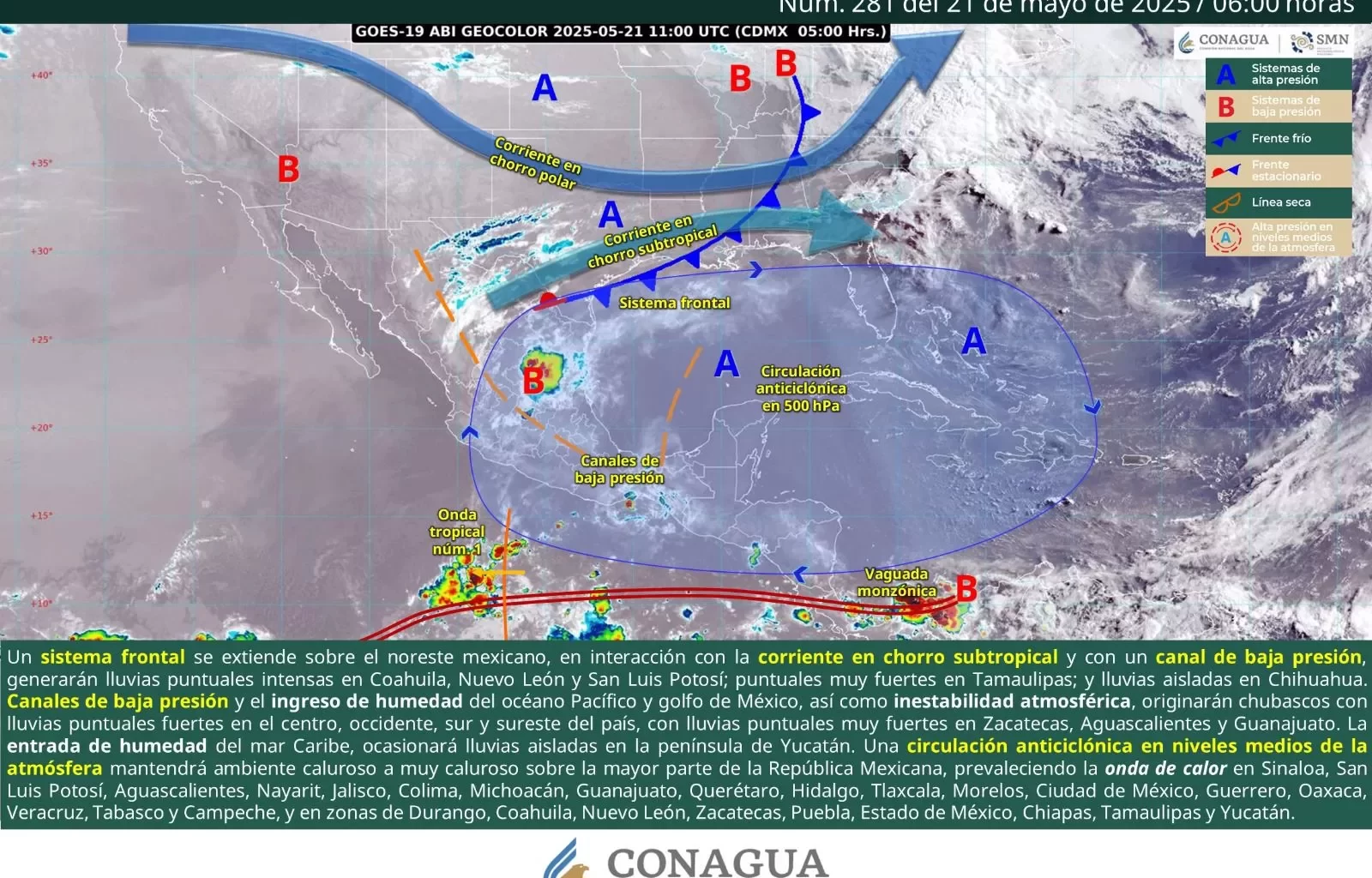 De acuerdo con el pronóstico del tiempo emitido por la Comisión Nacional del Agua (Conagua), los vientos dominantes serán del sur y sureste con algunas ráfagas al paso de la lluvia.
