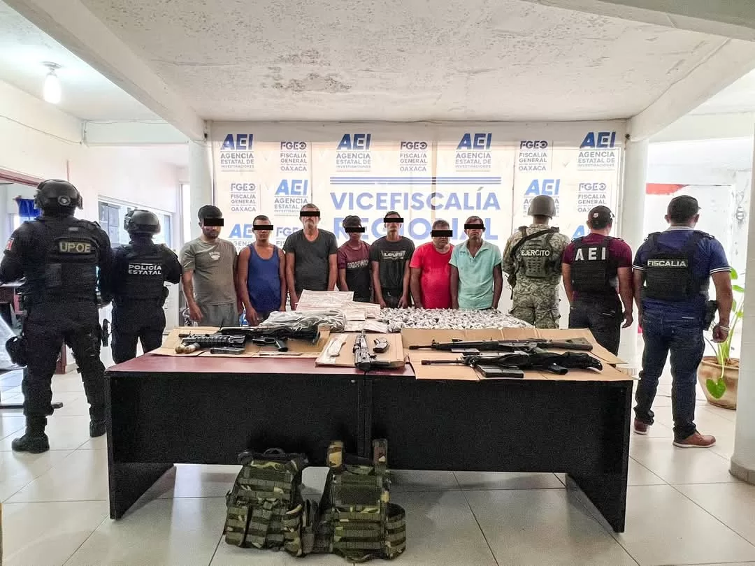 Oaxaca de Juárez a 23 de mayo de 2025.- Como parte de las acciones de investigación ministerial para combatir los delitos de alto impacto, la Fiscalía General del Estado de Oaxaca (FGEO) obtuvo auto de vinculación a proceso contra siete personas del sexo masculino, por el delito contra la salud en su modalidad de narcomenudeo en su hipótesis de posesión de metanfetamina y cannabis con fines de comercio, asociación delictuosa, delito contra servidores y funcionarios públicos, lesiones simples, quienes fueron detenidos luego de agredir -con disparos de arma de fuego- a elementos de la Policía Estatal, en hechos cometidos en la región de la Costa.
