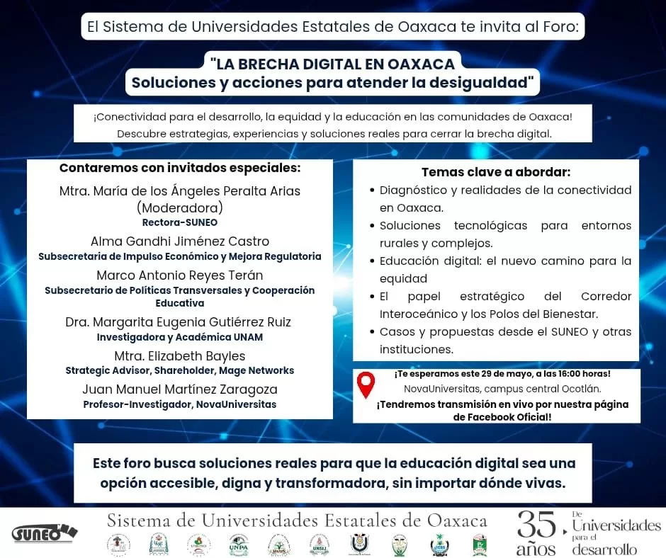 Oaxaca de Juárez, Oax. 27 de mayo de 2025.- A fin de generar un espacio de análisis sobre la conectividad para el desarrollo, equidad y la educación en las comunidades; el Sistema de Universidades Estatales de Oaxaca (Suneo) realizará este jueves 29 de mayo el conversatorio “La brecha digital en Oaxaca: soluciones y acciones para atender la desigualdad”.