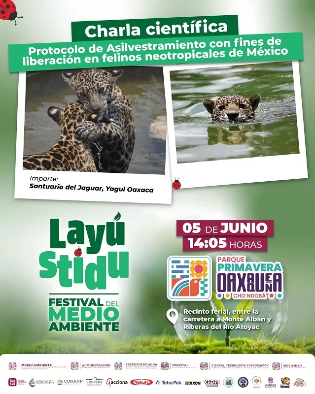 Oaxaca de Juárez, Oax; 1 de junio de 2025.- El Festival del Medio Ambiente “Layú Stidu”, que se llevará a cabo este 5 de junio en el Parque Primavera Cho Ndobá, será el escenario en el que se presentará el Protocolo de Asilvestramiento con fines de liberación en felinos neotropicales de México.