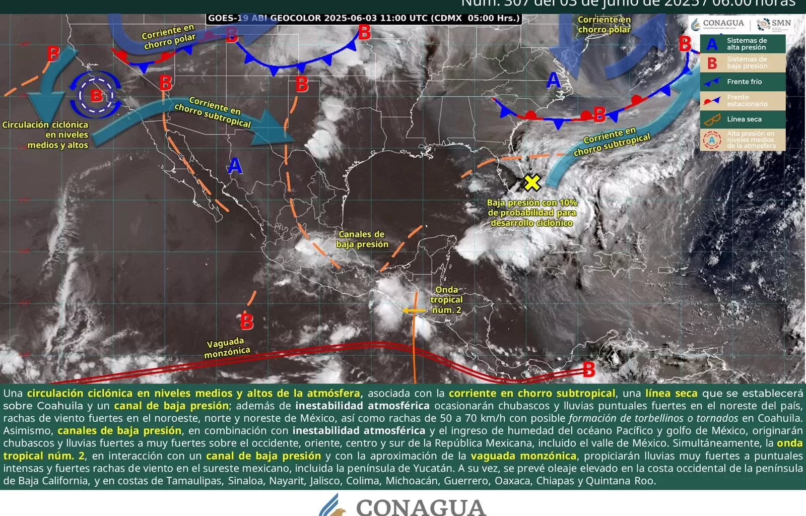 Oaxaca de Juárez, Oax. 3 de junio de 2025.- La Coordinación Estatal de Protección Civil y Gestión de Riesgos (CEPCyGR) informa que, este martes, se mantendrá la inestabilidad provocada por el flujo de humedad de la vaguada monzónica hacia el interior de la entidad, en combinación con el paso de la onda tropical número 2, lo que desarrollará nubosidad baja y media en gran parte de Oaxaca.
