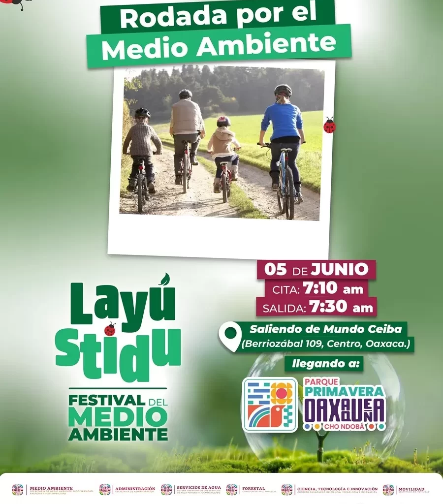 Oaxaca de Juárez, Oax. 4 de junio de 2025.- El Gobierno del Estado invita a sumarse al arranque del Festival del Medio Ambiente “Layú Stidu”, que iniciará este 5 de junio con la Rodada por el Medio Ambiente, un paseo en bicicleta abierto a toda la población.