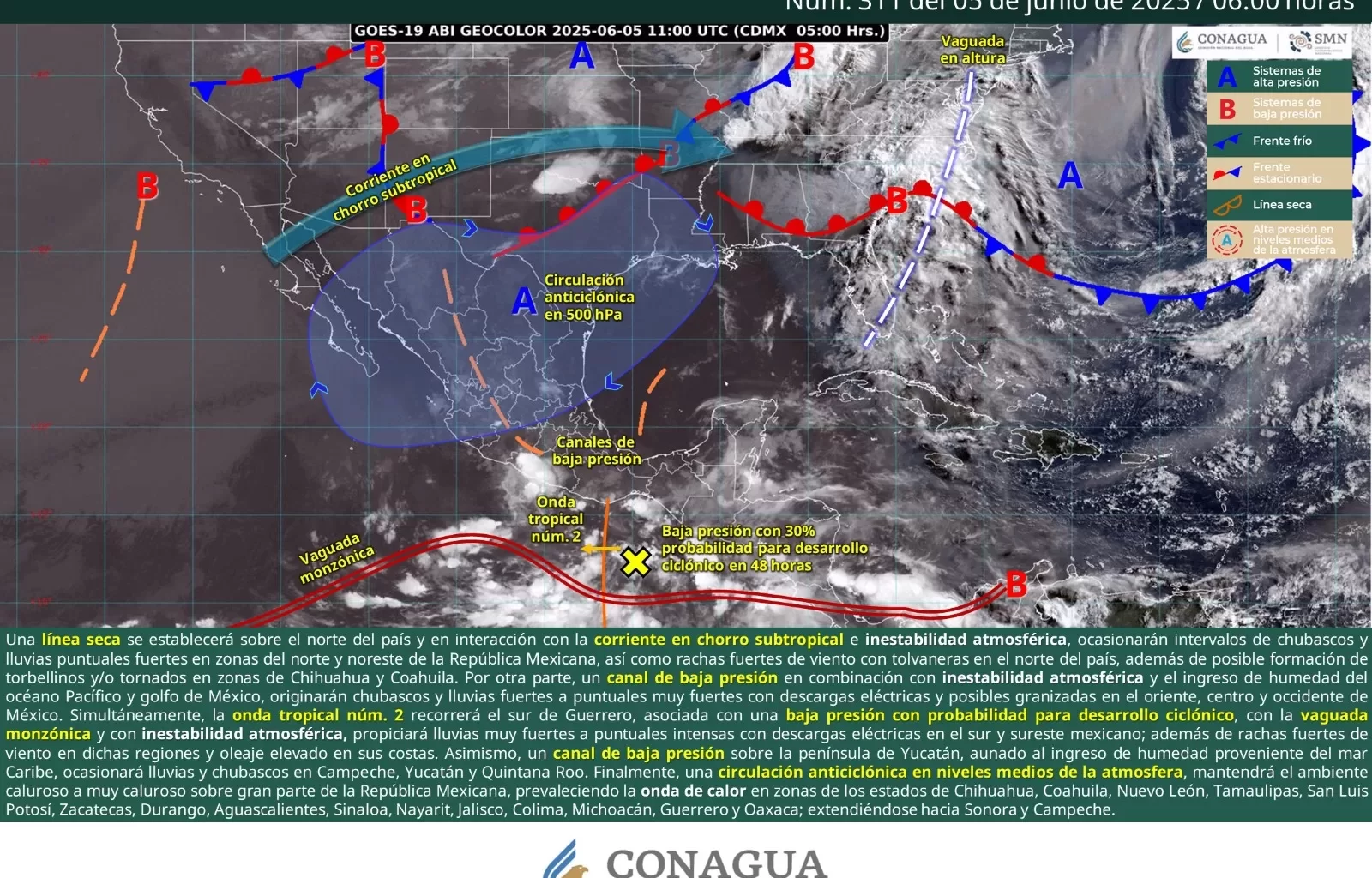 Esto es ocasionado por el remanente de humedad de la onda tropical número 2 en combinación con el flujo de humedad de la vaguada monzónica. Asimismo, hay probabilidad de tormentas locales fuertes asociadas con actividad eléctrica y rachas de viento por la tarde-noche, en especial en áreas montañosas.
