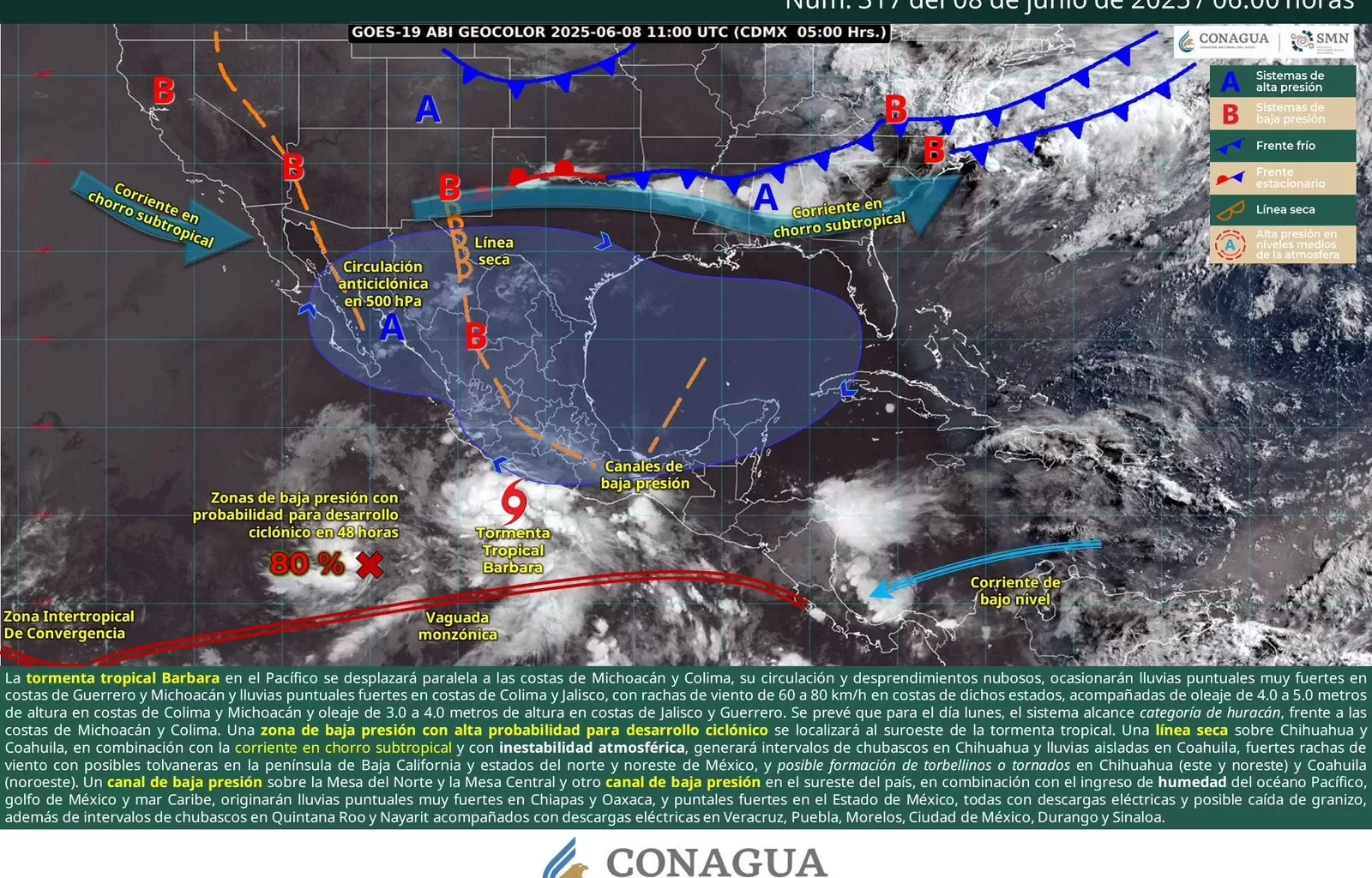 Oaxaca de Juárez, Oax. 8 de junio de 2025.- La Coordinación Estatal de Protección Civil y Gestión de Riesgos (CEPCyGR) informa que, este domingo, una amplia zona de baja presión frente a las costas de Guerrero y Michoacán podría evolucionar a Depresión Tropical con movimiento al oeste noroeste.