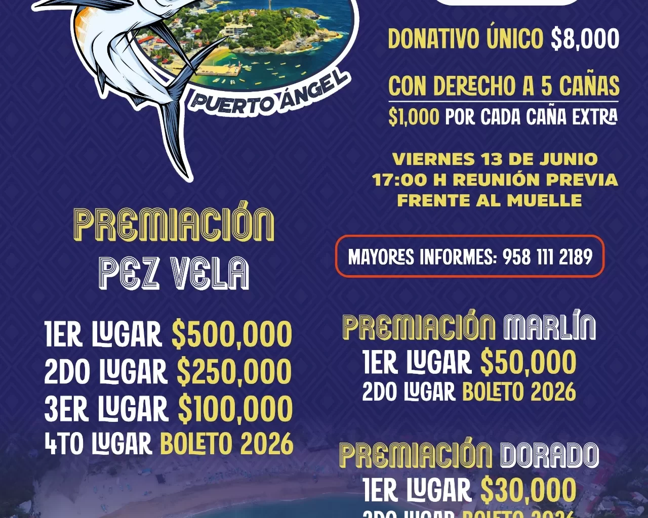Recordaron que se premiará en la categoría Pez Vela, con 500 mil pesos al primer lugar; 250 mil al segundo; 100 mil al tercero; y un boleto para la edición 2026 al cuarto lugar.