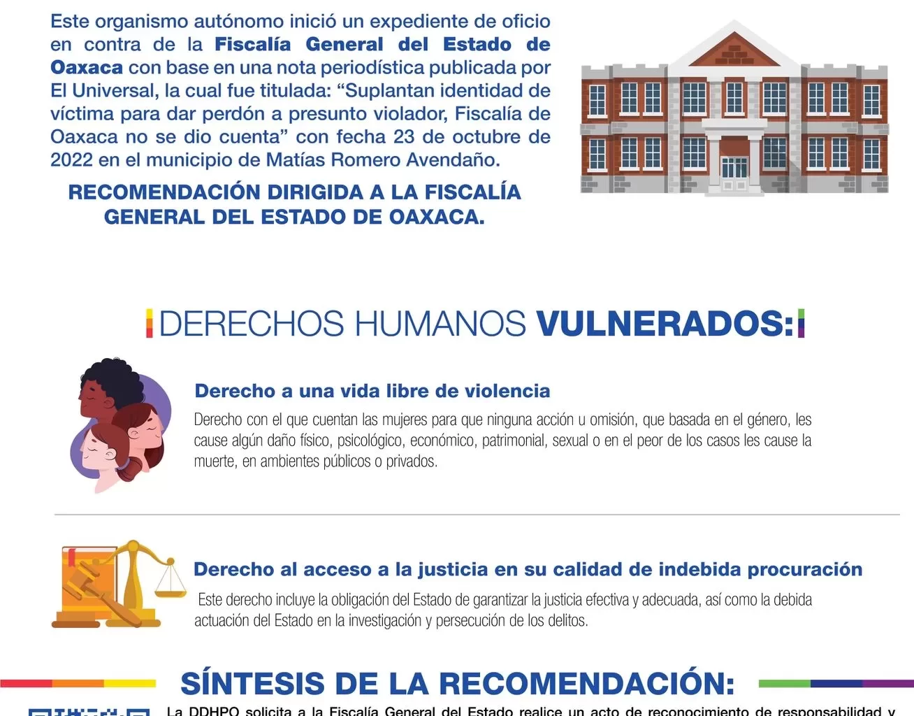 El 12 de octubre de 2022, este organismo autónomo inició una investigación de oficio derivada de una nota periodística publicada en el portal de El Universal, titulada: “Suplantan identidad de víctima para dar perdón a presunto violador, Fiscalía de Oaxaca no se dio cuenta”, donde se señaló que una persona del sexo femenino se hizo pasar por la víctima para otorgar el perdón al presunto agresor, lo que permitió que el Juez de Control revocara la orden de aprehensión por el delito de violación agravada.