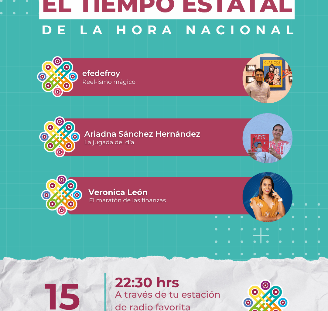 El Tiempo Estatal de la Hora Nacional es un esfuerzo de difusión que es posible gracias a la colaboración entre la Coordinación de Comunicación Social del Gobierno del Estado de Oaxaca, el Sindicato de Trabajadores de la Industria de la Radiodifusión, Televisión y Telecomunicaciones (STIRTT), Sección Oaxaca y la Corporación Oaxaqueña de Radio y Televisión (Cortv); quienes invitan a la ciudadanía a conocer más sobre los proyectos que transforman positivamente al estado.