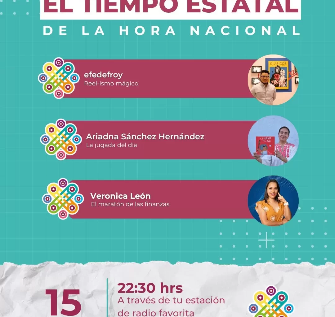El Tiempo Estatal de la Hora Nacional es un esfuerzo de difusión que es posible gracias a la colaboración entre la Coordinación de Comunicación Social del Gobierno del Estado de Oaxaca, el Sindicato de Trabajadores de la Industria de la Radiodifusión, Televisión y Telecomunicaciones (STIRTT), Sección Oaxaca y la Corporación Oaxaqueña de Radio y Televisión (Cortv); quienes invitan a la ciudadanía a conocer más sobre los proyectos que transforman positivamente al estado.