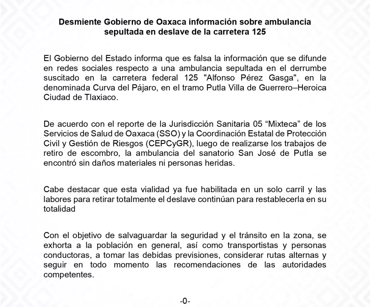 El Gobierno del Estado informa que es falsa la información que se difunde en redes sociales respecto a una ambulancia sepultada en el derrumbe suscitado en la carretera federal 125 “Alfonso Pérez Gasga”, en la denominada Curva del Pájaro, en el tramo Putla Villa de Guerrero–Heroica Ciudad de Tlaxiaco.