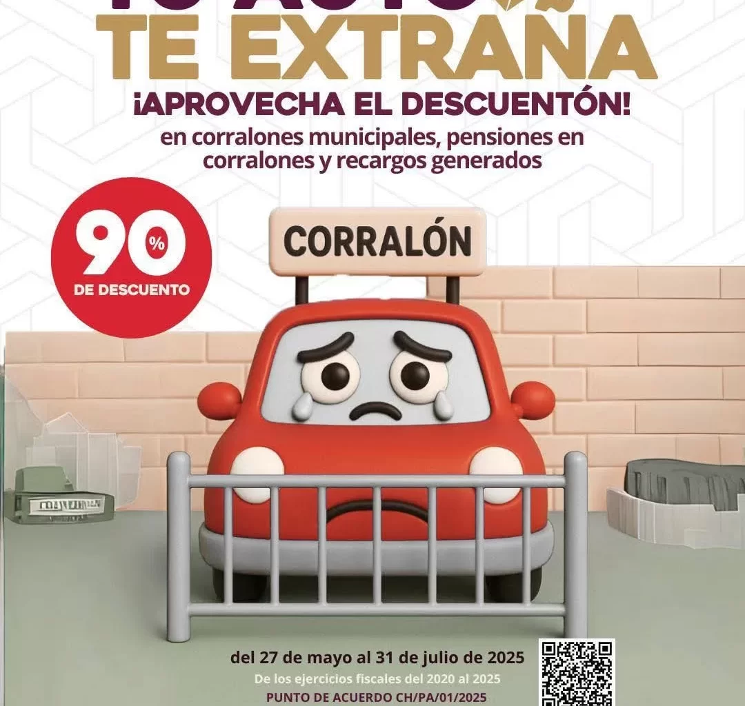 • 90% de descuento en los conceptos de salvamento y estancia aplicables en los corralones municipales correspondientes a los años 2020, 2021, 2022, 2023, 2024 y 2025