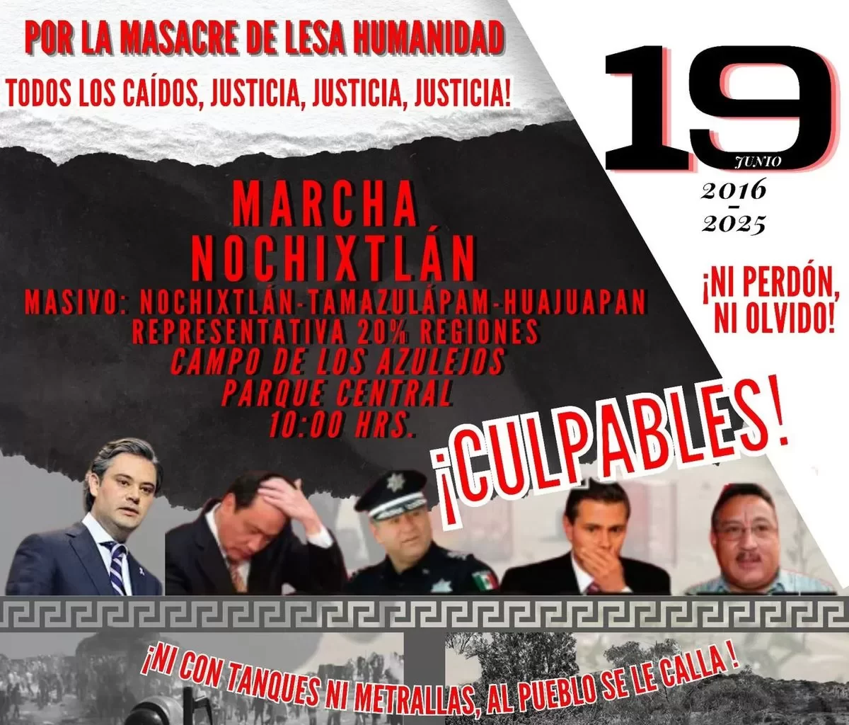 En el marco del noveno aniversario de la represión ocurrida en Asunción Nochixtlán, el Comité Ejecutivo de la Sección 22 de la Coordinadora Nacional de Trabajadores de la Educación (CNTE) convocó a sus agremiados a participar en una marcha estatal el próximo miércoles 19 de junio, en los municipios de Tlaxiaco y Nochixtlán, a partir de las 10:00 horas.