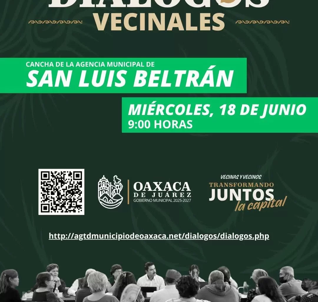 Oaxaca de Juárez, Oax., 17 de junio de 2025.– El Gobierno Municipal de Oaxaca de Juárez invita a la ciudadanía a participar en una nueva edición de los Diálogos Vecinales, que en esta ocasión se llevará a cabo en la cancha de la agencia municipal de San Luis Beltrán, este miércoles 18 de junio a partir de las 9:00 horas.